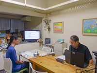 スタッフとパソコンの構成についてお話し中。三重シューレで使っていた古いパソコンを、欲しい子どもにもらっていただきました。
