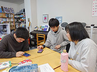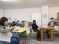 近くにいる人とおしゃべり。共通する好きなことのお話しだったり、今はやっていることだったり、のんびりお話しているので、いつでも気軽に入れるような雰囲気です。