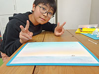 夕焼けと海の景色が完成しました。2時間で作品まで作ることができて子どもたちもびっくりしていました。