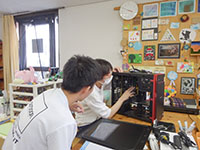 スタッフとパソコンの構成についてお話し中。三重シューレで使っていた古いパソコンを、欲しい子どもにもらっていただきました。