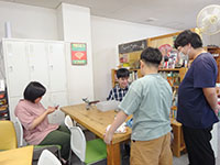 近くにいる人とおしゃべり。共通する好きなことのお話しだったり、今はやっていることだったり、のんびりお話しているので、いつでも気軽に入れるような雰囲気です。